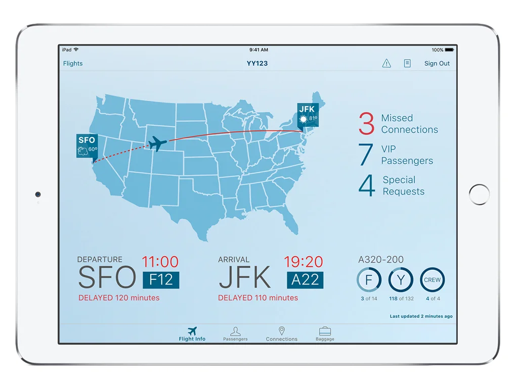 Passenger+ empowers flight crews to manage services provided to passengers inflight. With the passenger plus app, flight crews are able to track flight delays and missed connections on a single dashboard, rebook flights for passengers while in transit, view passenger seat maps & special meal information, and view passenger connection and baggage information.