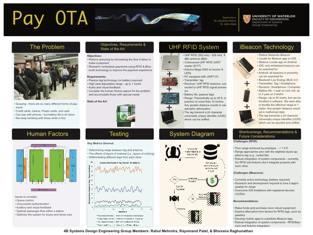 Such lag stems from passenger retrieval, storage, and use of the payment method, which requires “tapping” to accommodate. Pay OTA proposes a contactless payment system around RFID and Bluetooth standards, reducing micropayment times. Our team presented a hardware design at a public symposium in April 2014. The poster complimented the hardware design and was designed using Adobe Photoshop.